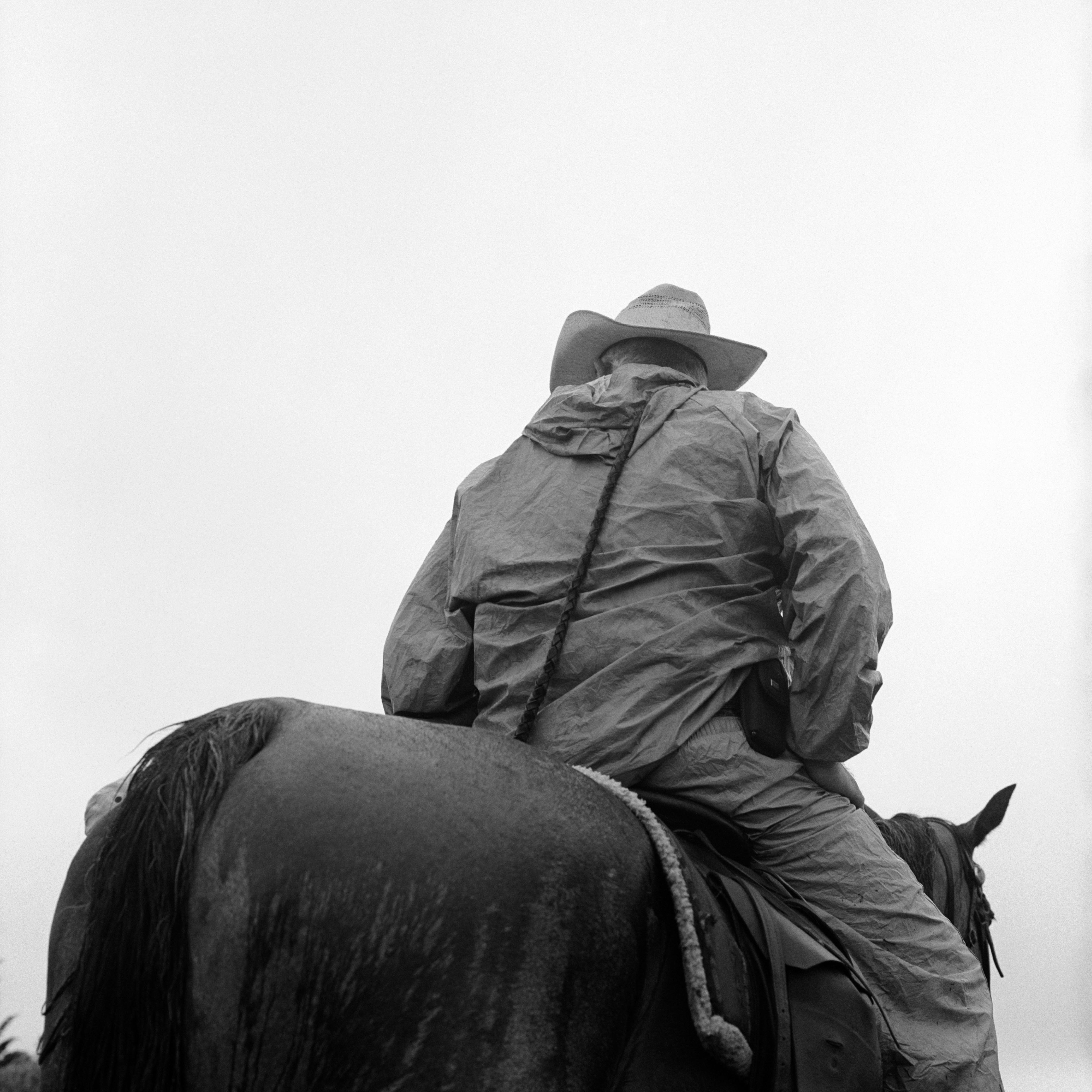 And this is us, waiting for over an hour in on-again-off-again thunderstorms for “slack tide” so the ponies could make their crossing.