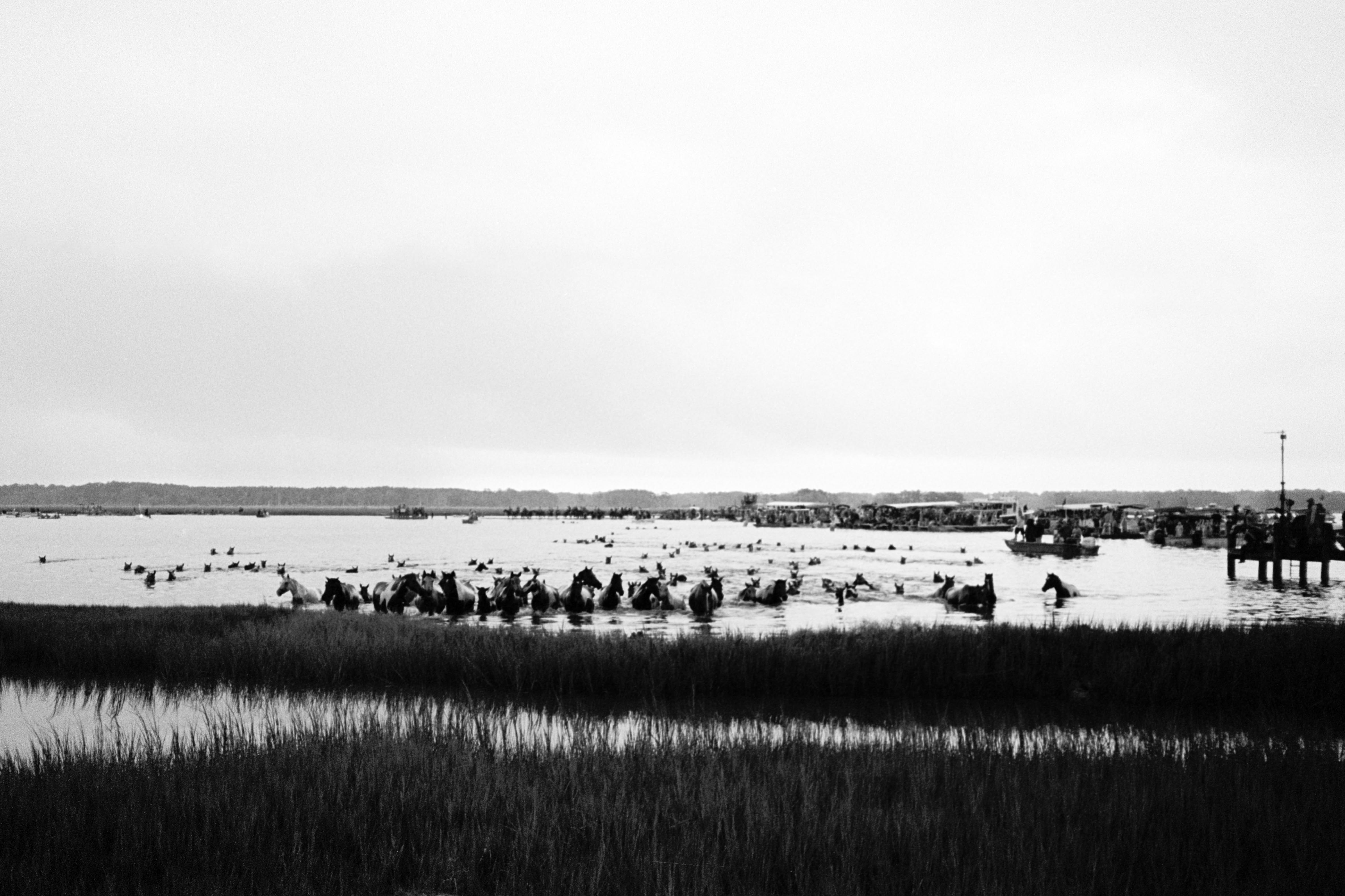 Finally, the signal flare shot up. The horsies hunkered down. And all that waiting paid off. The Saltwater Cowboys drove their ponies into the narrow strait from Assateague Island to Chincoteague Island. Strait toward us. All in all the swim lasted four minutes. But we’ll have the memory of those horses making landfall for a whole heck of a lot longer.